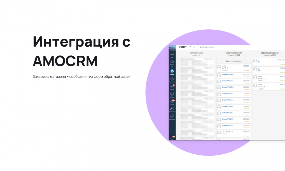 Выгружает заказы из магазина и сообщения из обратной связи в AMOCRM, создает сделку и контакт.