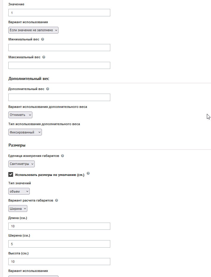 Создание произвольных тарифов и комбинаций настроек (посылка online, курьер online и тд и тп), настройка веса и габаритов под каждый вариант тарифа.