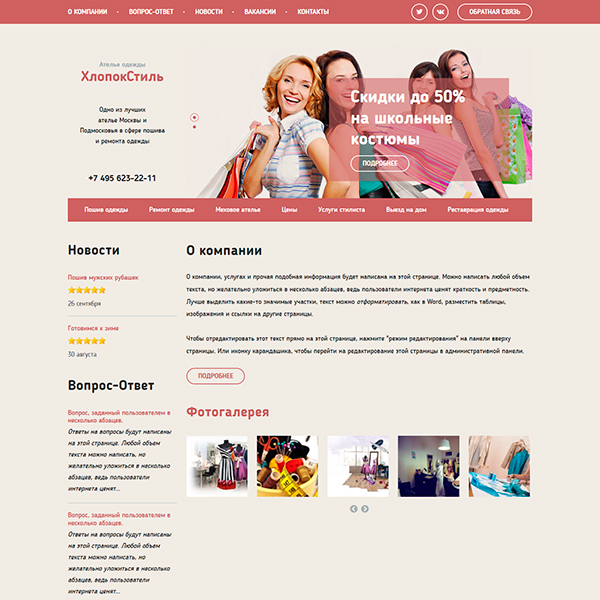 Адаптивный шаблон сайта ателье одежды может быть использован для корпоративного ресурса фирмы практически любого направления деятельности. Два меню - основное и меню услуг с подразделами, блок лого со слоганом и контактами слева от основного слайдера на главной странице, новостной блок, информация о компании, вопрос-ответ, блок фотогалереи делают шаблон универсальным. Изменения основных элементов оформления сайта, цветовой гаммы, позволят использовать шаблон под любую тематику: адвокат, аптека, база отдыха, врач, клиника, муж на час, натяжные потолки, пивоварня, репетитор, бюро переводов, ТСЖ, эвакуатор и многое другое.