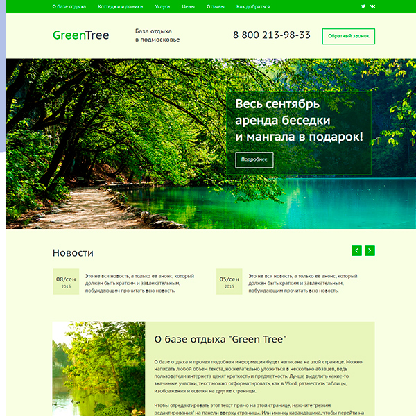 Адаптивный шаблон сайта базы отдыха может быть использован в качестве корпоративного сайта компании любого направления деятельности. Основное меню с выпадающими подразделами, большой слайдер на главной, форма заявки, новости, информация о компании, блок фотогалереи со скроллом делают шаблон готовым к применению на сайтах следующих направлений: боулинг, врач, библиотека, доставка воды, имидж студия, кафе, мужской клуб, бар и многие другие - изменения основных элементов оформления сайта позволят использовать шаблон под любую тематику.