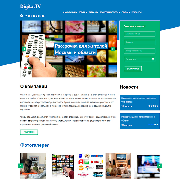 Адаптивный шаблон сайта компании, занимающейся установкой цифрового (кабельное, спутниковое) ТВ, найдет свое применение в качестве корпоративного сайта практически любой организации. Возможность расположения пунктов основного меню в несколько рядов, слайдер, форма записи на установку с возможностью добавления дополнительных полей без потери общего стиля сайта, новостной блок, информация о компании, блок фотогалереи со скроллом делают шаблон готовым к применению на сайтах следующих направлений: стоматологическая клиника, пейнтбольный клуб, кафе, ремонт квартир, офисов, натяжные потолки, остекление балконов, оконная компания, ветеринарная клиника, установка кондиционеров, детский сад и многое другое - изменения основных элементов оформления сайта позволят использовать шаблон под любую тематику.