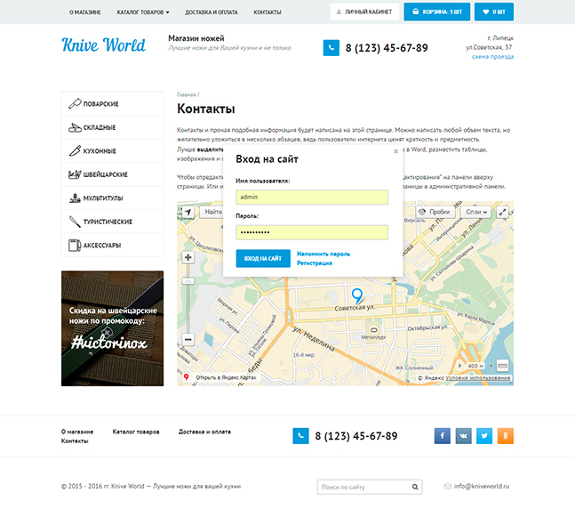 Эргономичный шаблон для магазина ножей и аксессуаров со структурированным ассортиментом, оформленным с помощью многоуровнего меню каталога, большим баннером-слайдером, новостями и поиском товаров по параметрам. Разделы, касающиеся компании и условий доставки вынесены в главное меню, что упрощает и ускоряет поиск нужной информации для покупателей. Для удобства пользования меню каталога товаров вынесено в вертикальный блок с возможностью добавлять подкатегории товаров. Многочисленные всплывающие окна (вход в личный кабинет, содержимое корзины заказов, положить в корзину или продолжить покупки, покупка в один клик) явлюятся украшением данного шаблона. Каждый значимый раздел имеет свой блок на главной странице сайта, таким образом, все важное для пользователя всегда на виду.